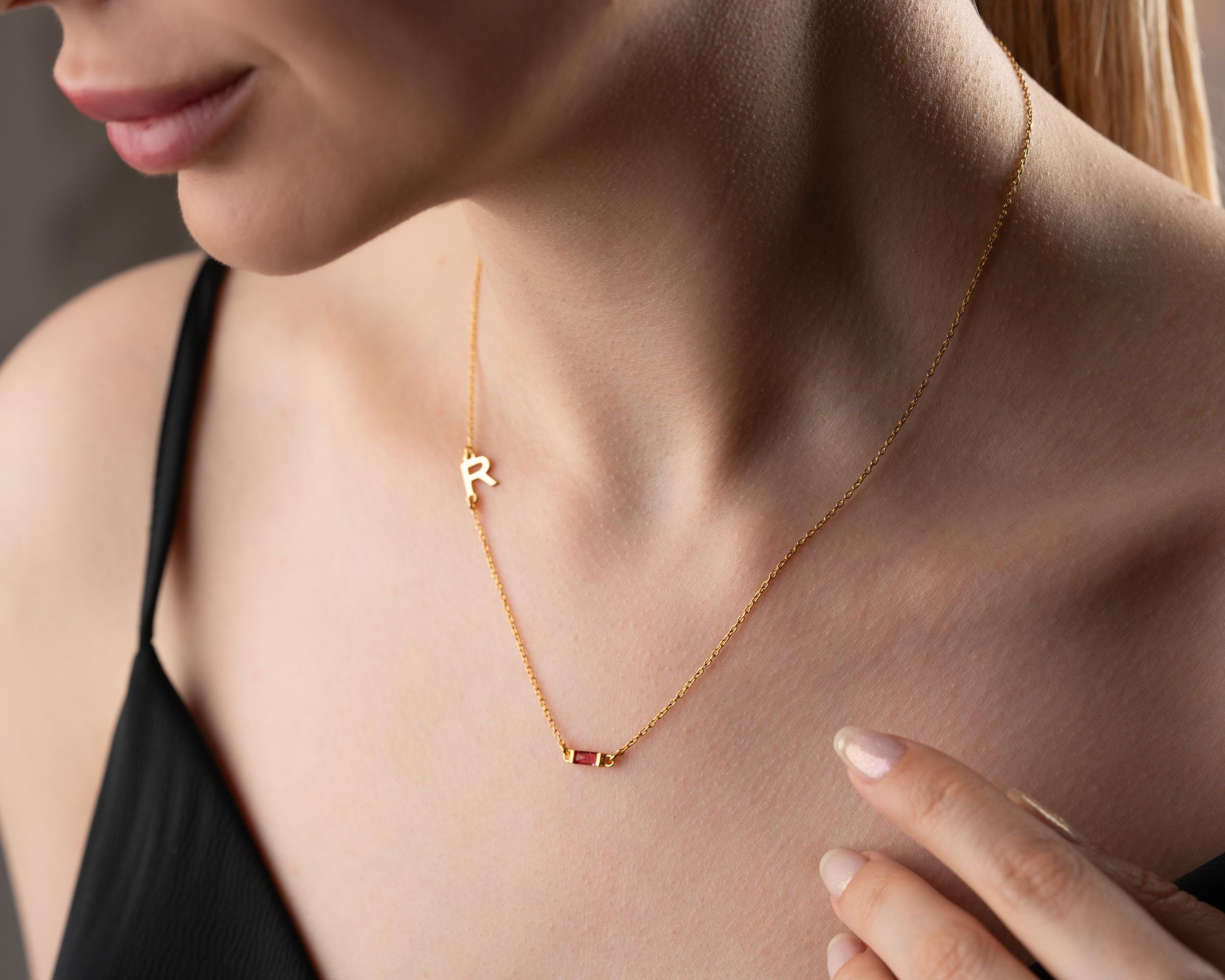 Celebrate your unique style with our Initial Birthstone Necklace, beautifully crafted with a shimmering baguette-cut birthstone and a personalized letter charm. This elegant sideways design adds a modern twist to a classic look, making it perfect for everyday wear or special occasions. A thoughtful gift for birthdays, anniversaries, or just because — it’s ideal for moms, sisters, or best friends. A meaningful piece that combines sentiment, sparkle, and sophistication in one stunning necklace.