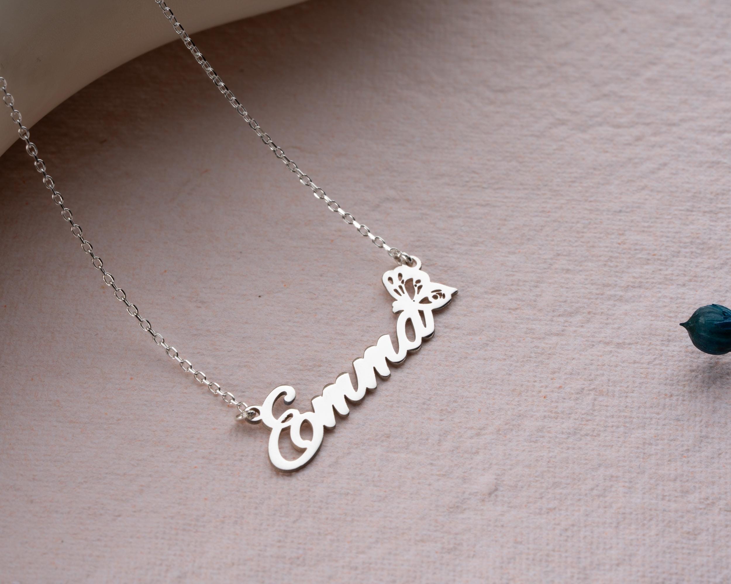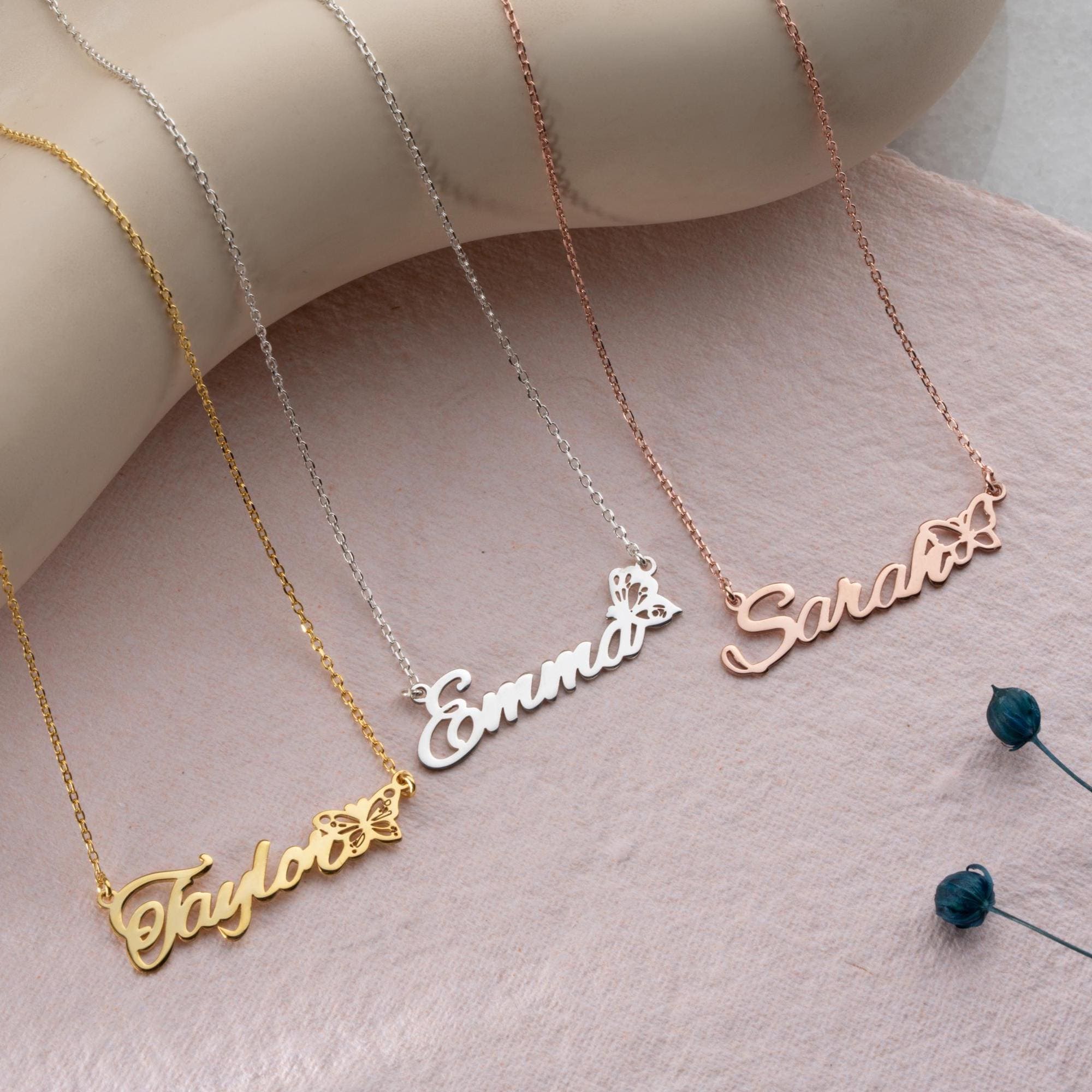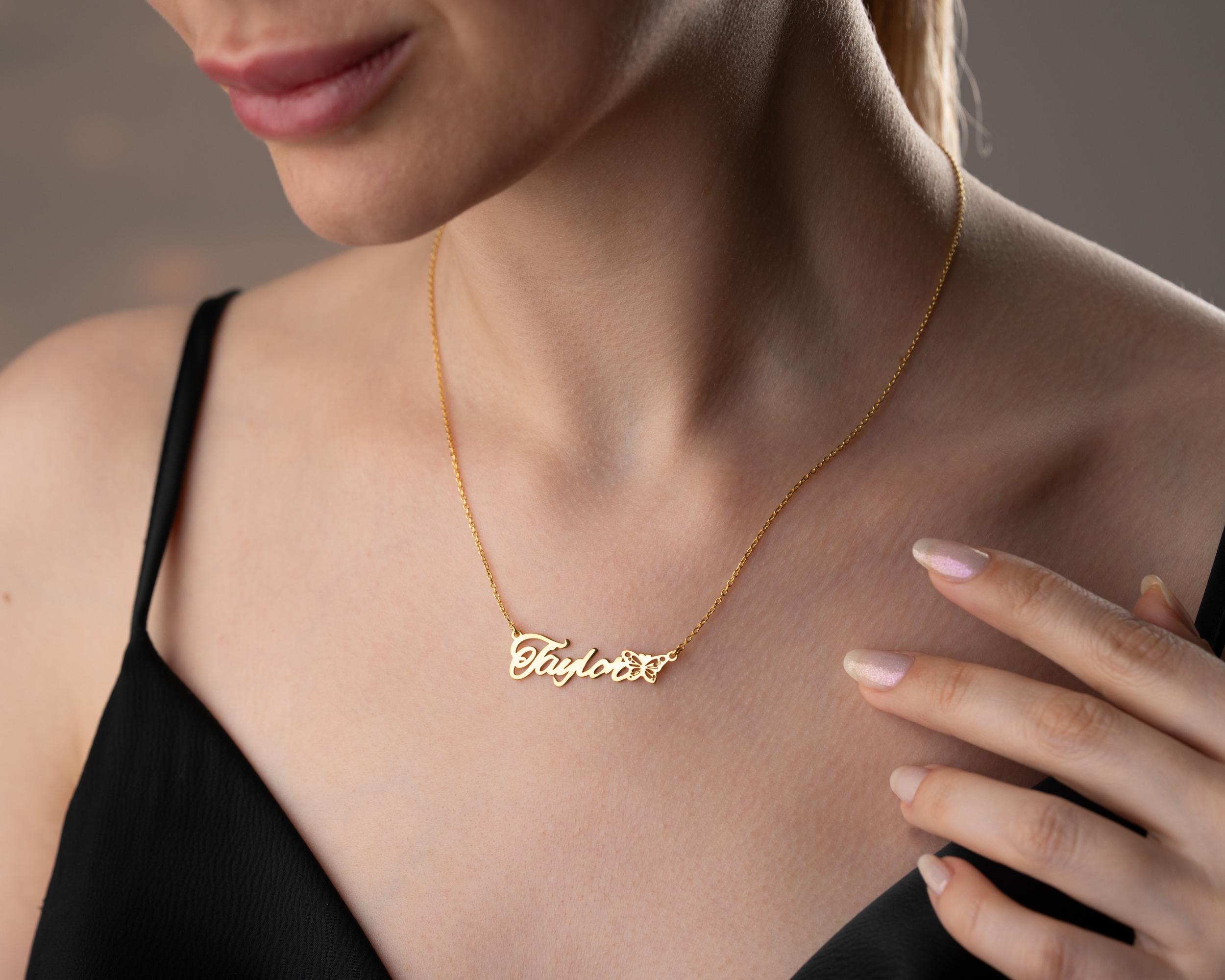 Celebrate her uniqueness with our Personalized Name Necklace featuring a graceful butterfly detail. This custom name necklace is designed in a horizontal layout, offering a sleek and elegant look that suits everyday style. The butterfly adds a symbolic touch—whether it represents transformation, a birth month, or simply a love of nature—making it a meaningful piece of jewelry for birthdays, anniversaries, or heartfelt gifts.
