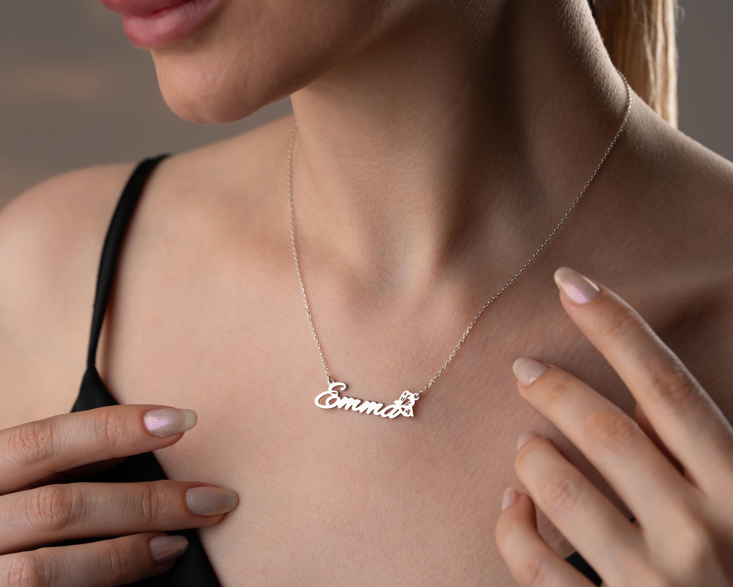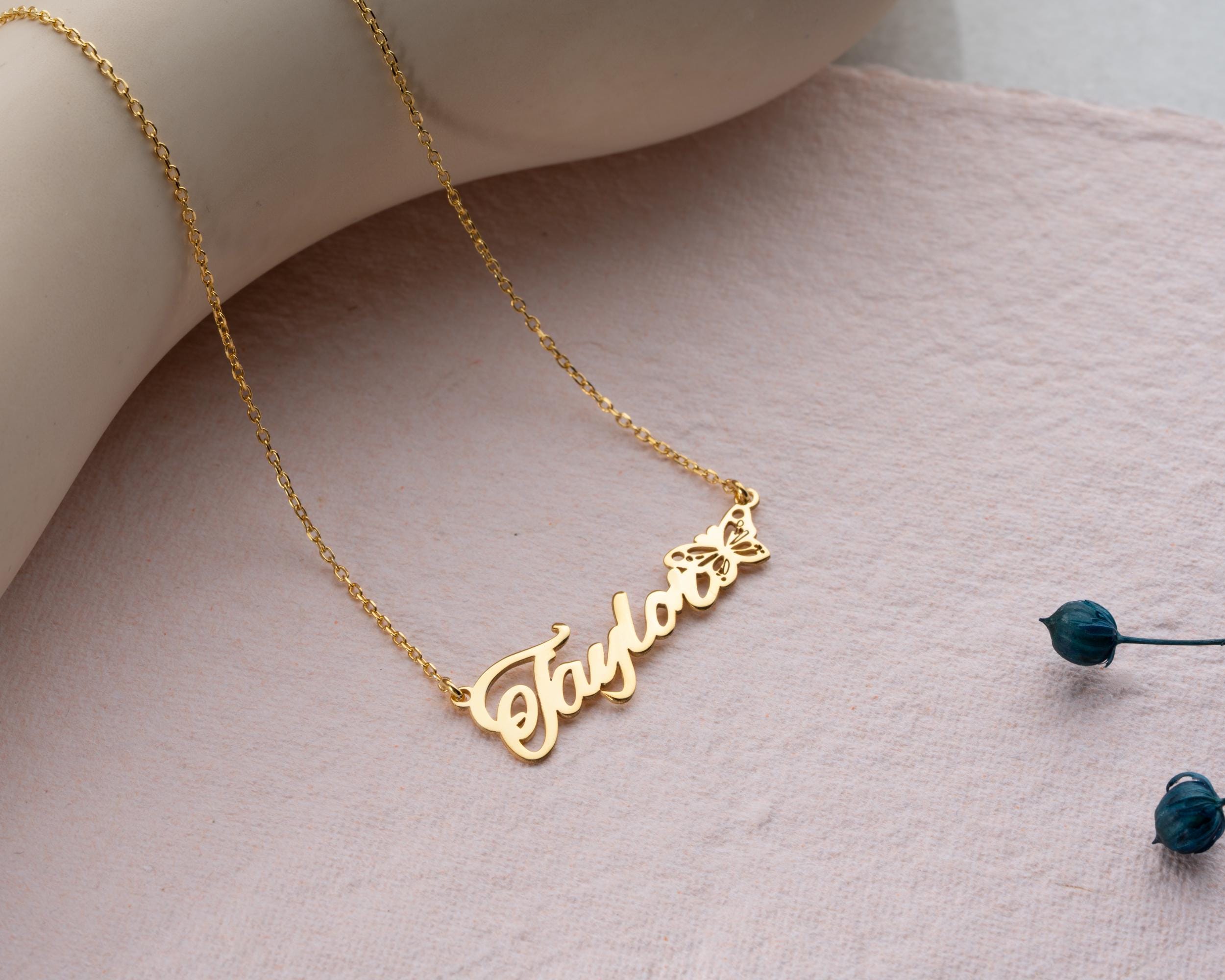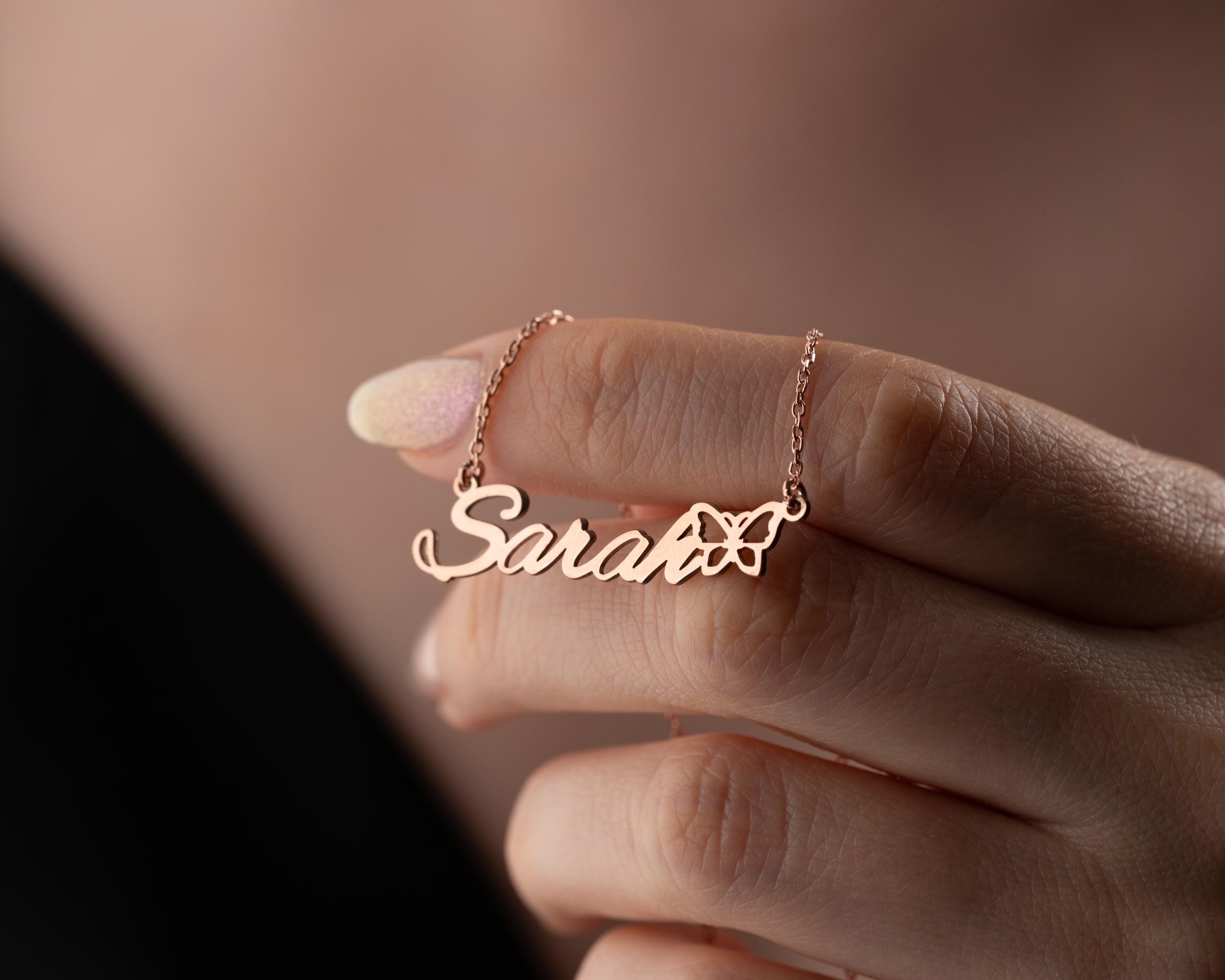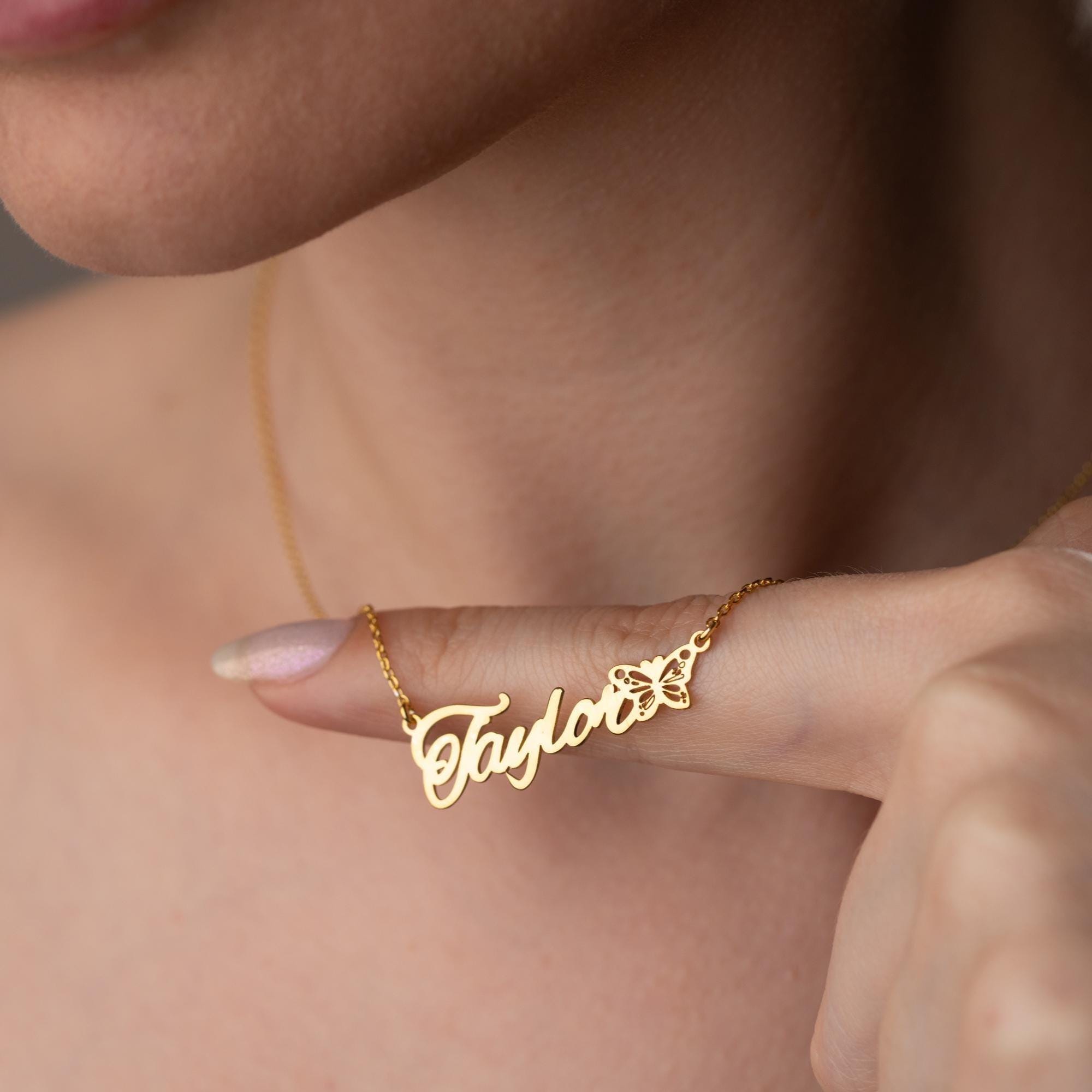 Celebrate her uniqueness with our Personalized Name Necklace featuring a graceful butterfly detail. This custom name necklace is designed in a horizontal layout, offering a sleek and elegant look that suits everyday style. The butterfly adds a symbolic touch—whether it represents transformation, a birth month, or simply a love of nature—making it a meaningful piece of jewelry for birthdays, anniversaries, or heartfelt gifts.