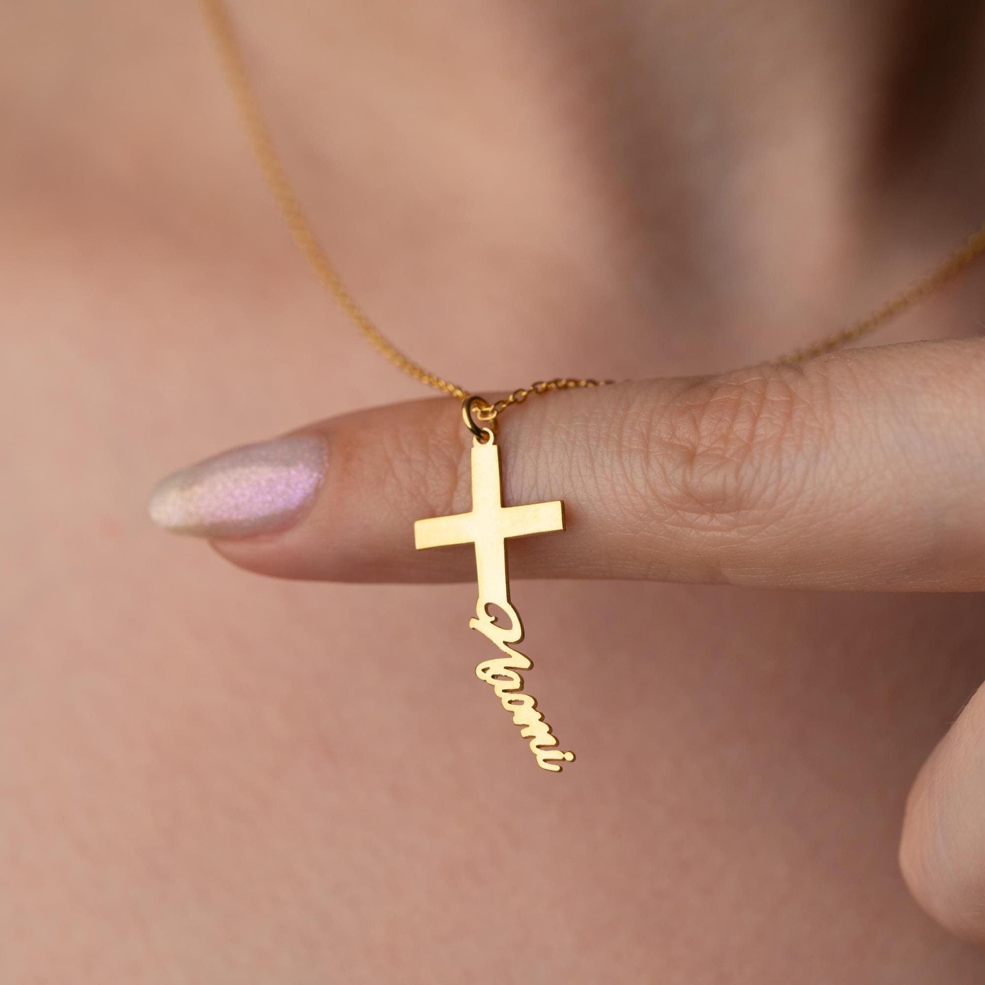 This Personalized Cross Name Necklace is a meaningful blend of faith and elegance, making it a perfect gift for life’s most sacred milestones. With its delicate cross and custom name detail, it becomes a one-of-a-kind keepsake that symbolizes love, protection, and blessing. Thoughtfully designed, it carries deep spiritual value while also being a timeless piece of jewelry.