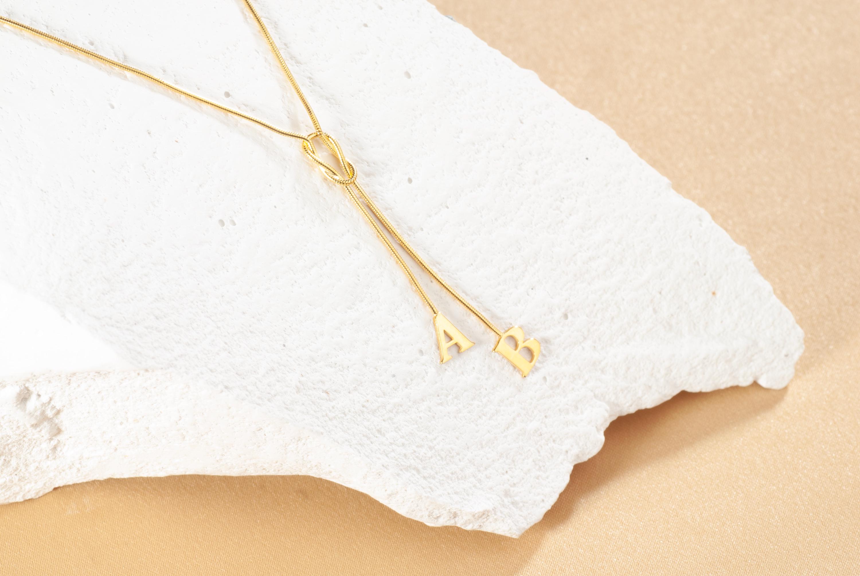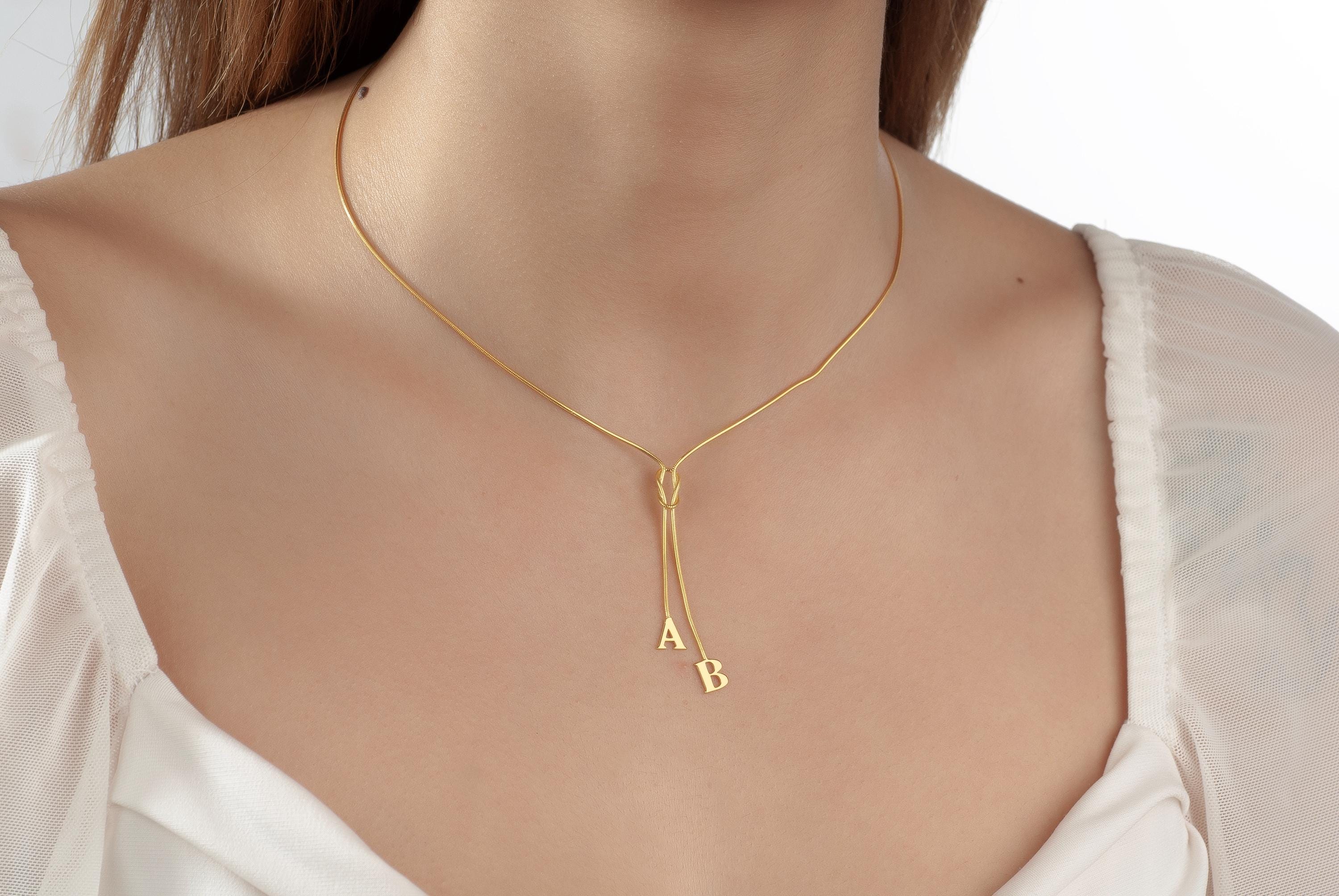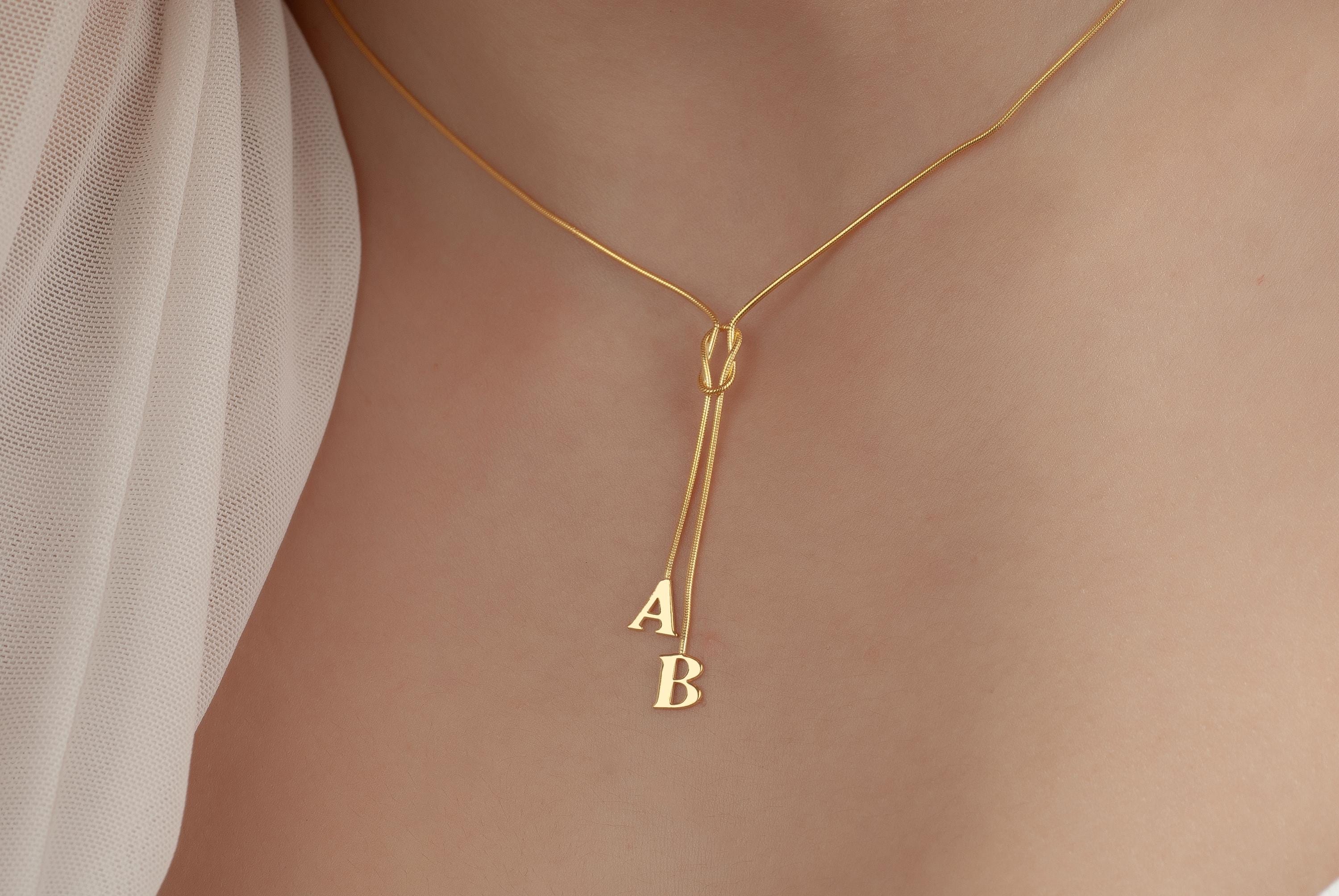 Personalized Y Necklace, Love Knot Y Necklace; Initial Lariat Necklace, Personalized Y Necklace, Handmade Solid Gold Silver Jewelry