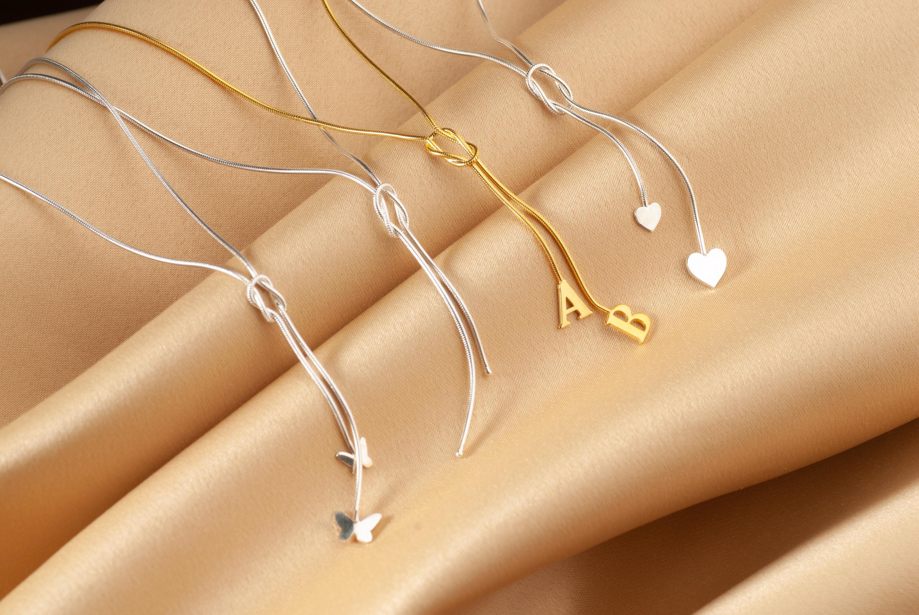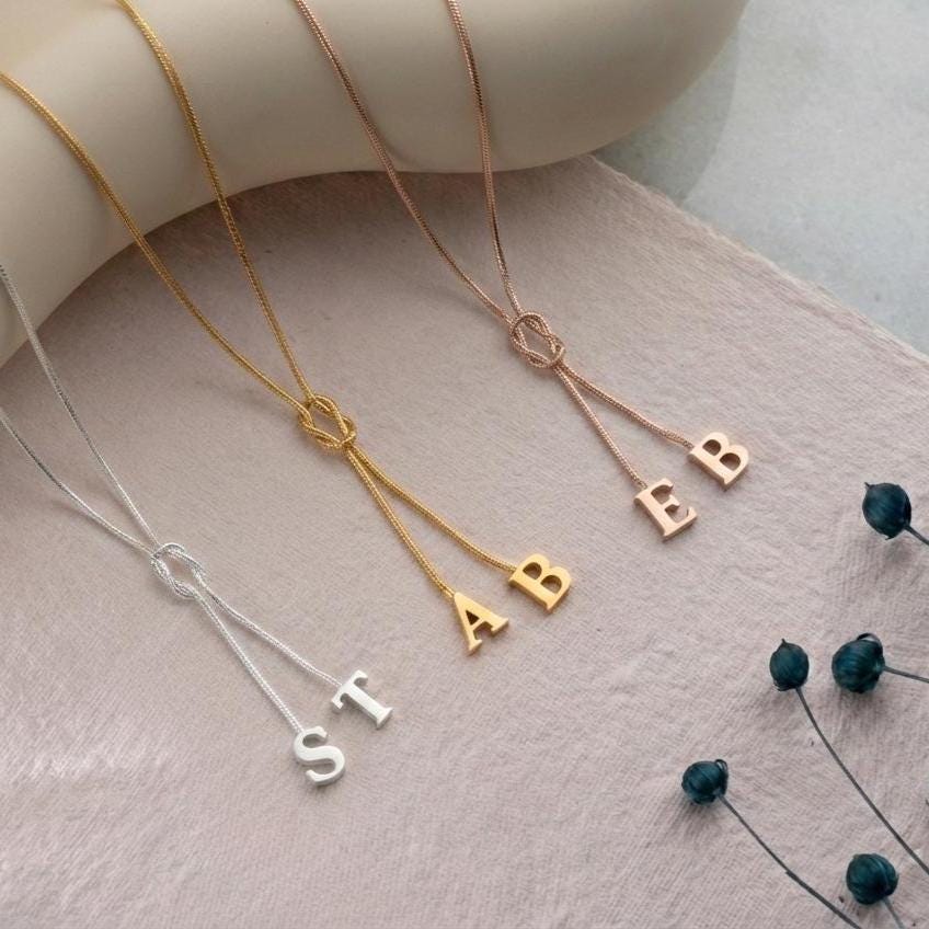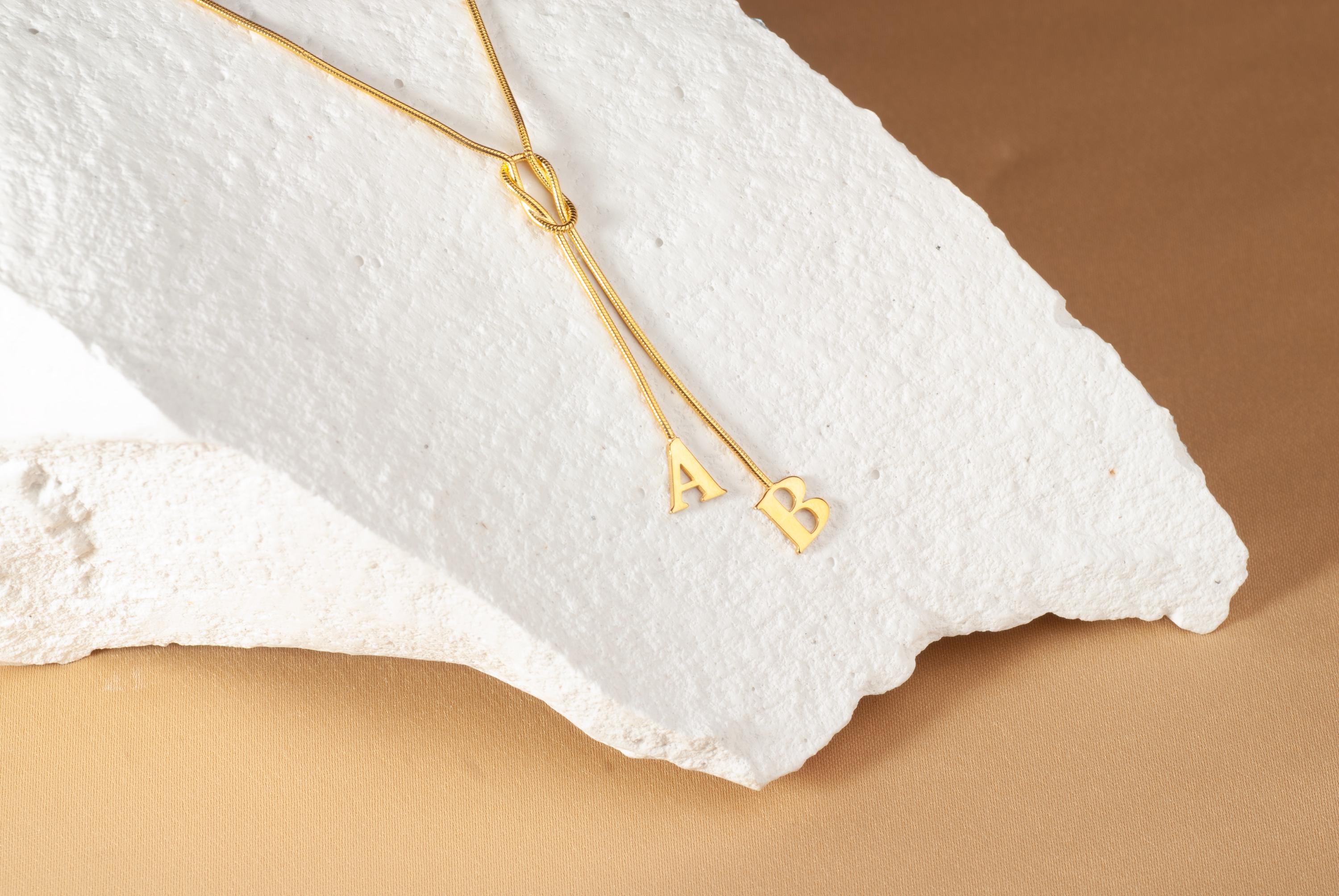 Personalized Y Necklace, Love Knot Y Necklace; Initial Lariat Necklace, Personalized Y Necklace, Handmade Solid Gold Silver Jewelry